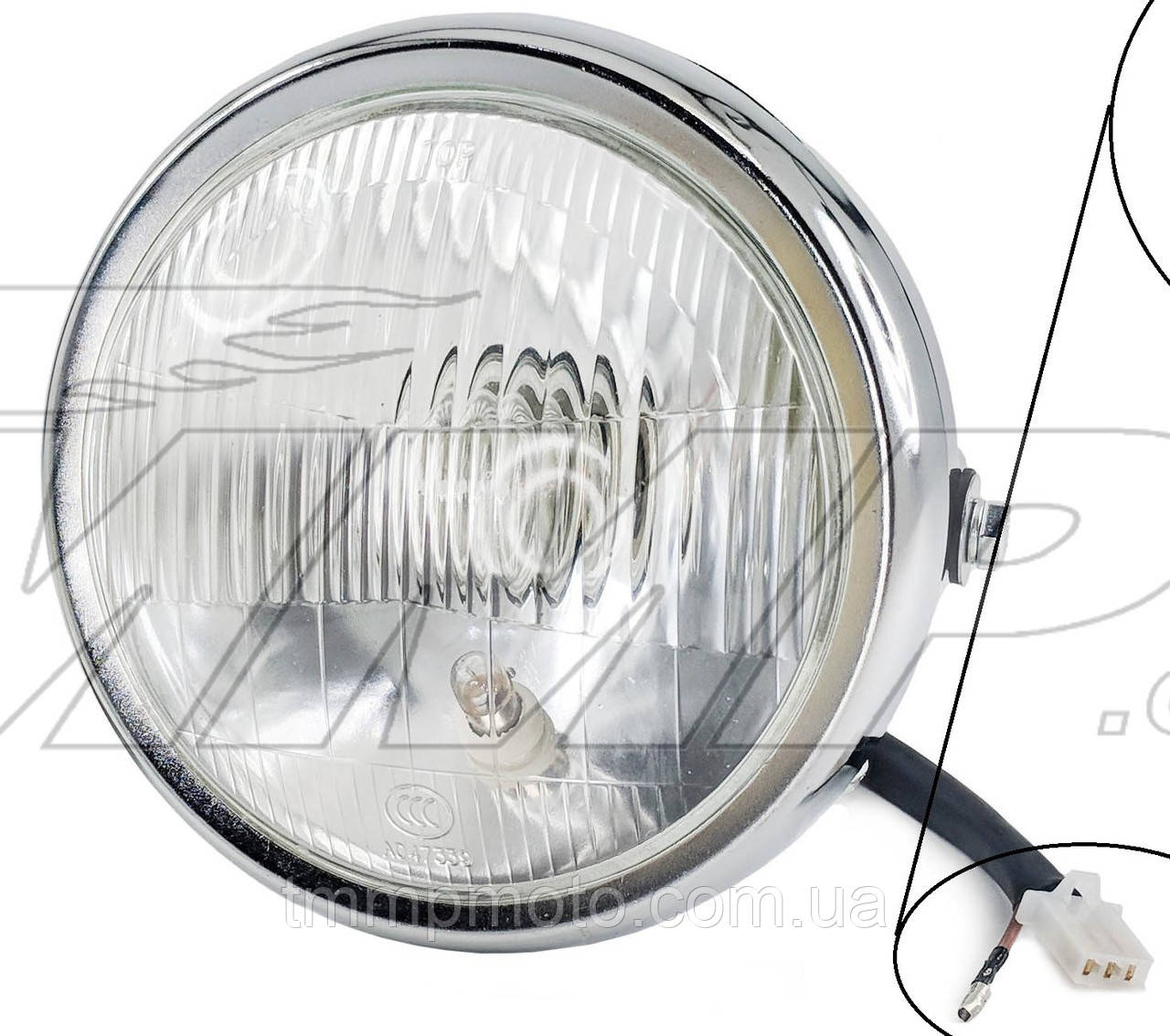 Фара Альфа кругла хром пластик у складі з лампочкою та фішкою в комплекті для 4 тактних мопедів Alpha/ Delta/Vista/Mustang/Sabur/Fermer/Riga/Active/Keeway/Horse/Lifan/ Jialing-Honda/Jianshe/Haojin / Dayang / Loncin / Sanlg ( Альфа / Дельта / Вістка / Мустанг / Фермер / Хорс / Сапур / Лідер / Патріот / Кивей / Ліфан / Жіалінг / Джанше / Хаогенін / Лонсин / Даянг / Санг ) і скутеретт Viper Active / Horse/Supra X/Mustang/Sabur/Fermer/Riga/Zongshe CubBike (Вайпер Актив/ Хорс/Супра Ікс/Марант/Самур/Зоншен/Корадо